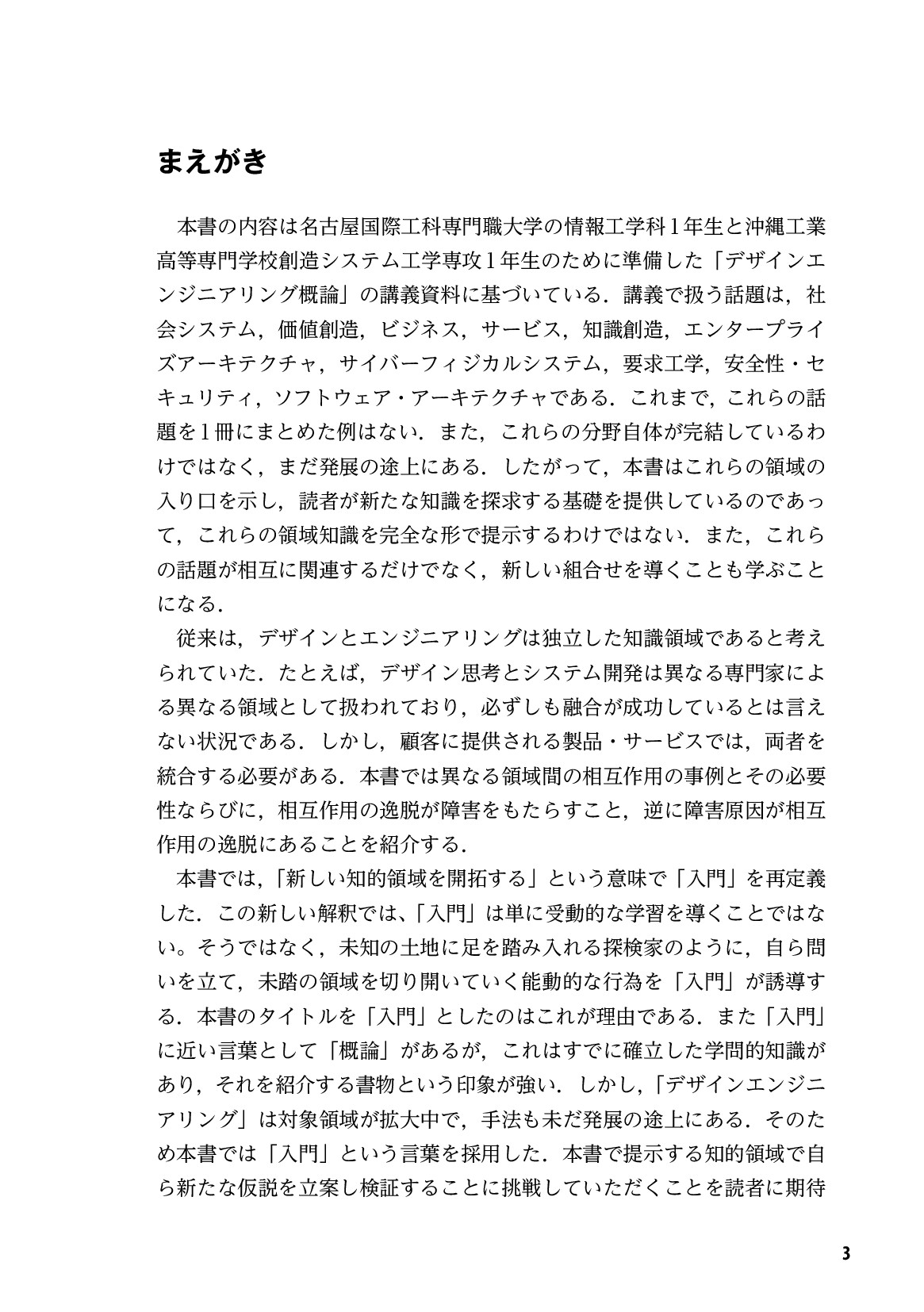 本書は、名古屋国際工科専門職大学と沖縄工業高等専門学校での講義資料に基づき、デザインとエンジニアリングの融合を説く一冊です。本書は「入門」を「自ら問いを立て、未踏の領域を切り拓く能動的な行為」と再定義し、読者が新たな仮説を立案・検証することを期待しています。