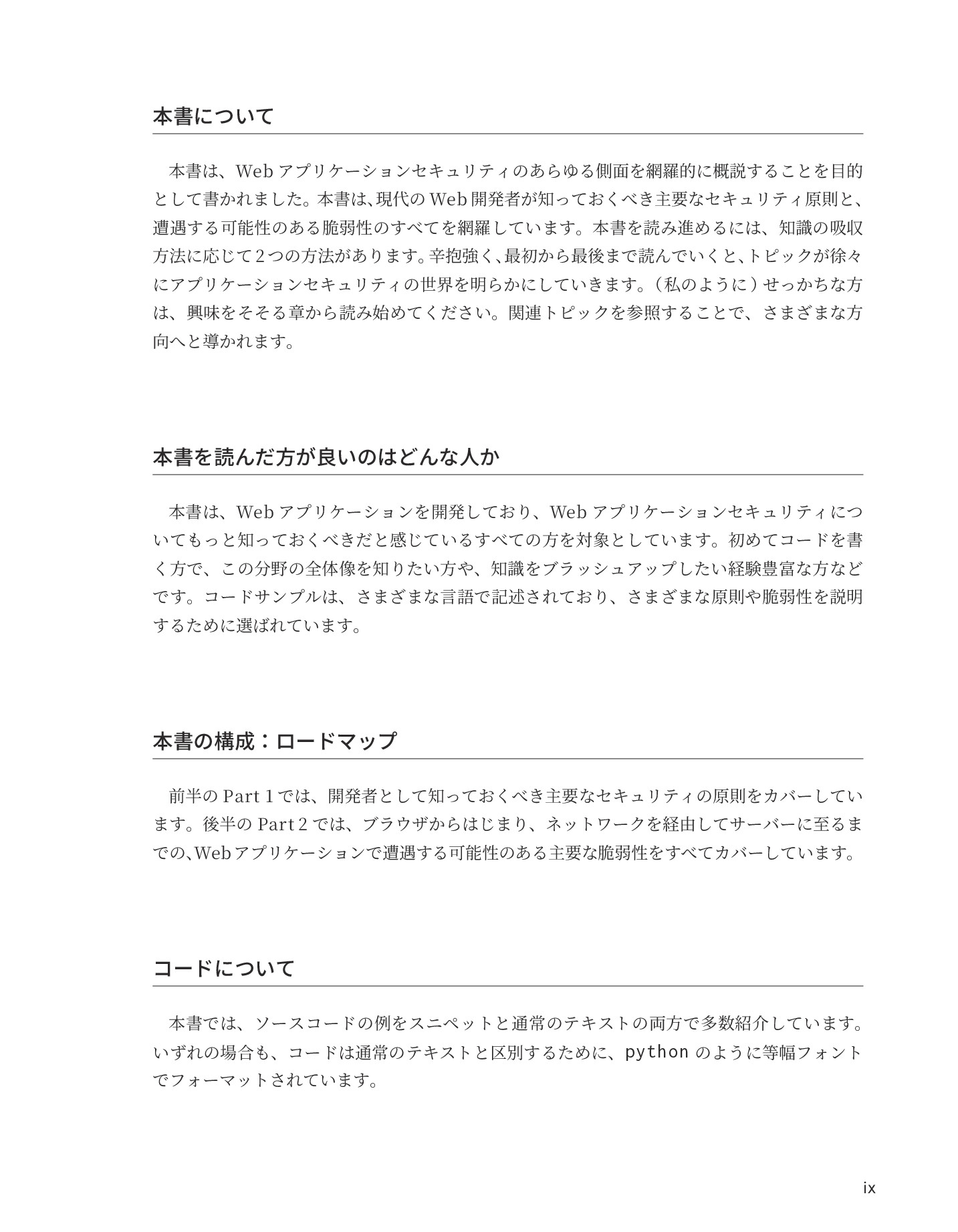 以下はPDF版の先頭ページなどから、一部を抜粋して縮小した画像です。 (※EPUB版を提供している書籍の場合、基本的に内容は同じですが、見映えは異なります。 またお使いのEPUBリーダによっても見え方は大きく異なることがあります。)