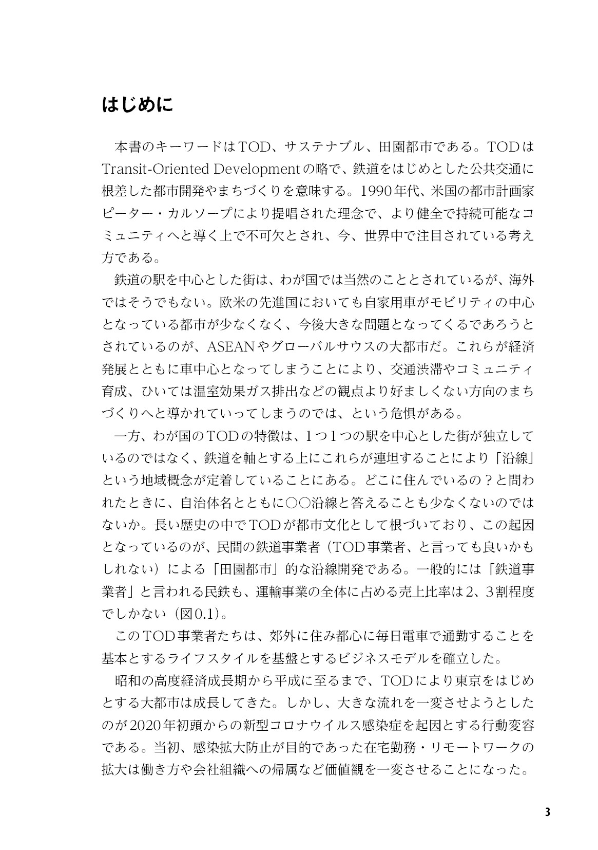 本書のキーワードはTOD、サステナブル、田園都市です。TODはTransit-Oriented Developmentの略で、鉄道をはじめとした公共交通に根差した都市開発やまちづくりを意味します。